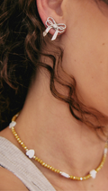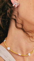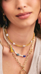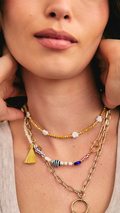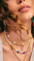 עשויה שילובי חרוזים בגוונים מקפיצים אליהם מצורץ גדיל בגוון צהוב חרדלי.