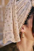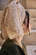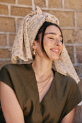 מטפחת הולי עשויה בד כותנה 100%טבעי עם רקמות מסורתיות מדהימות והדפסי פרחים קטנטנים בגוון חום זהבהב, לאורך כל היופי הזה תפור סרט עיגולים זהוב שנותן גימור מושלם