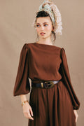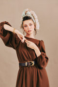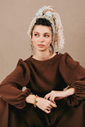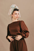 בד שיפון בצבע מנטה עם הדפסי פרחים רכים ועדינים אליהם מחובר בד פייטים בגוון חום בהיר שמתכתב עם טול הפייטים המוזהב המחובר בצדדים ויוצר חגיגיה אחת גדולה!