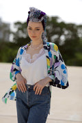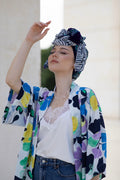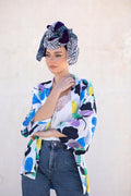 המטפחת מורכבת משלושה סוגי בדים מודפים טקסטורות ומרקמים שיוצרים חגיגה אחת גדולה.