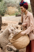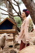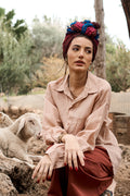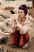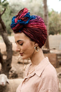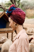 מטפחת עשויה בד משי טבעי עם גוונים מתחלפים של בורדו וכחול שנצבעו בצביעה ידנית בטכניקה מסורתית